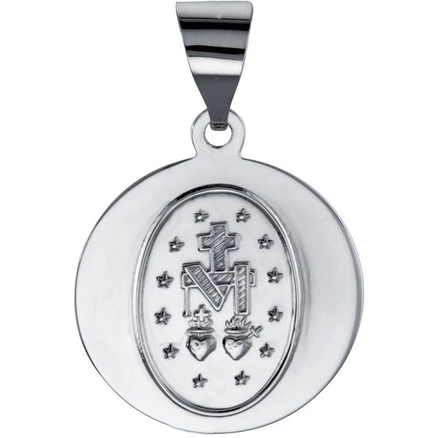 This Round Hollow Miraculous Medal available from Catholic Shop.comfeatures dimensions of 22.25 millimeters, approximately 7/8-inch round.