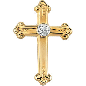 This 14 Karat Yellow Gold Cross Lapel Pin with Diamond measures 15 x 10.50 mm, roughly equivalent to 5/8-inch by 3/8-inch.