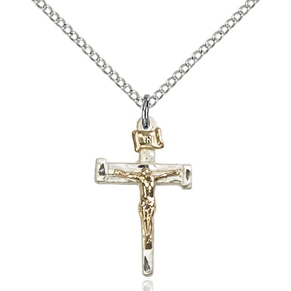 7/8 x 1/2-inch Two-Tone Gold-Filled and Sterling Silver Nail Crucifix Medal on an 18 inch Sterling Silver Light Curb Chain.