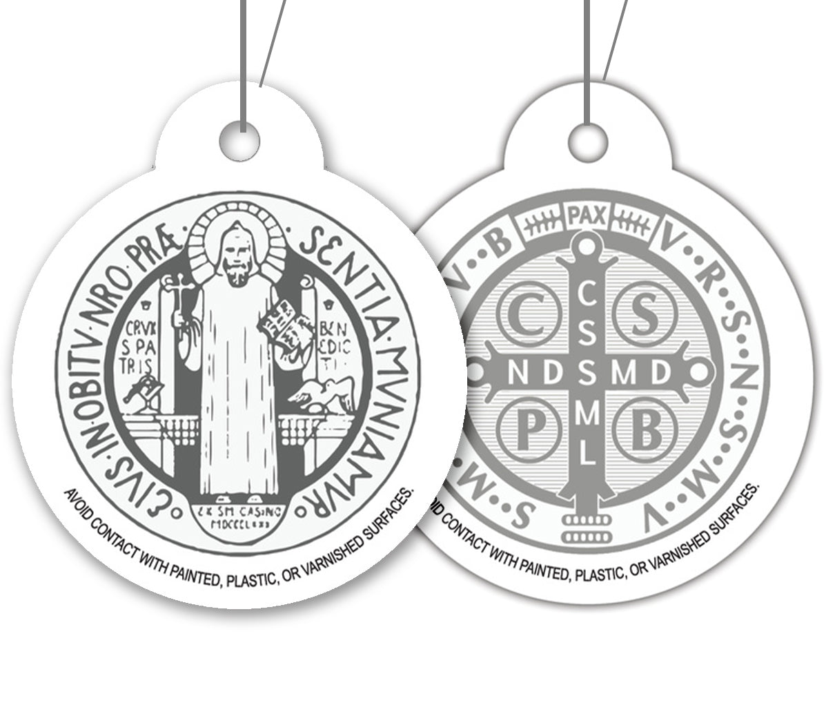 One side of the air freshener features the front design of the St. Benedict medal, while the other side features the back design of the medal.