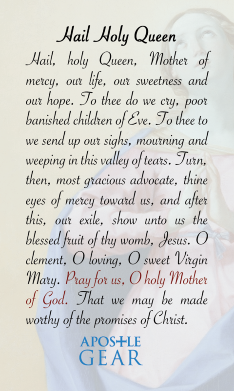 These Hail Holy Queen Prayer Cards by Apostle Gear feature the iconic Immaculate Conception painting. Printed in full high-gloss color, the card is about the size of a business card and fits perfectly in a wallet or pocket.