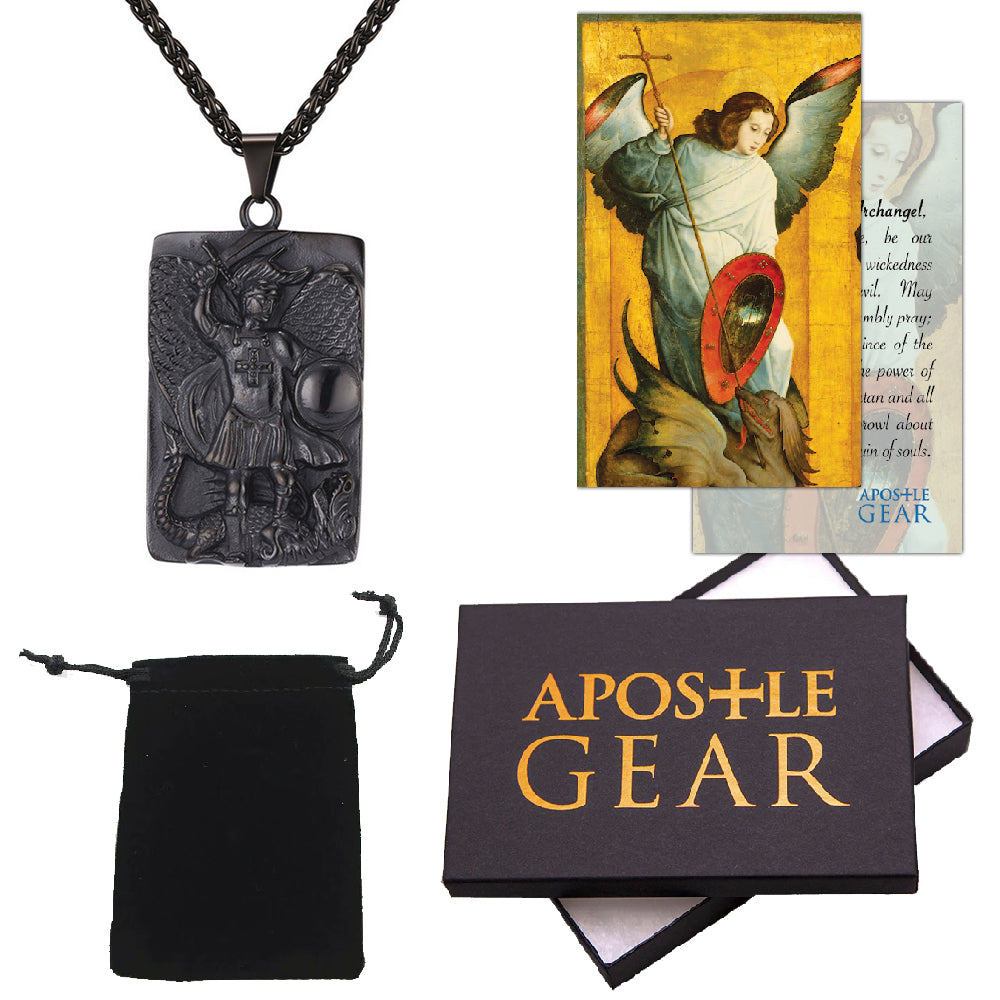 The pendant and necklace come together in a complimentary Apostle Gear gift box, a free St. Michael the Archangel Prayer holy card, and a Black Velvet Pouch for safekeeping on the go.