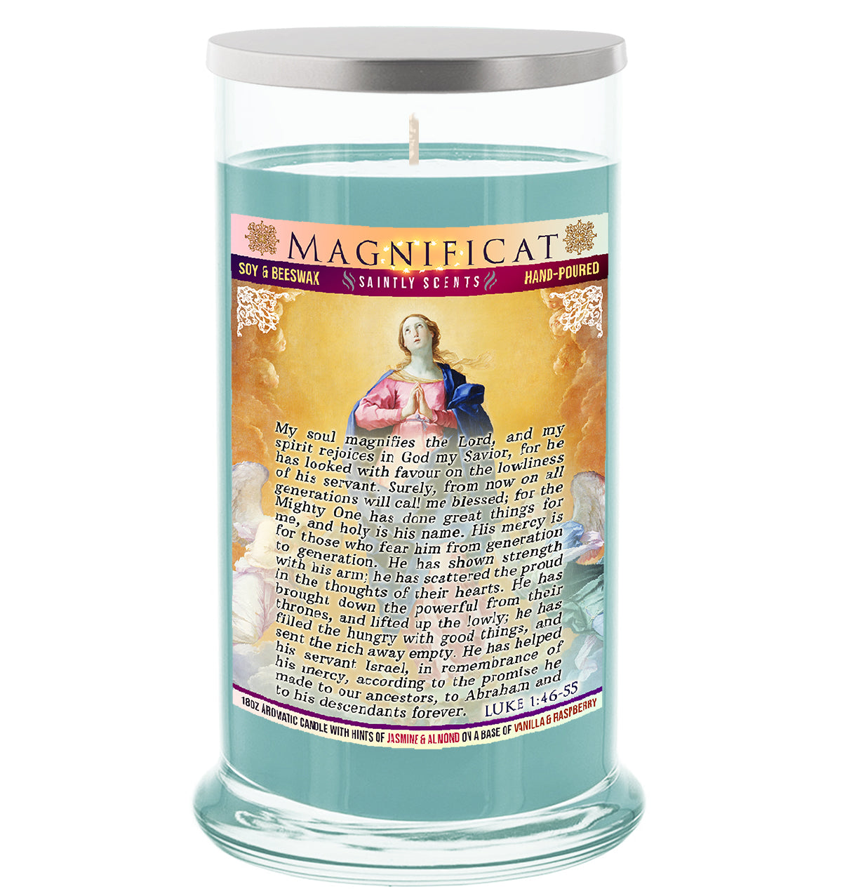 Our hand-poured Magnificat Scented Prayer Candle scented candle by Saintly Scents features a lovely Jasmine Almond Vanilla Raspberry fragrance.