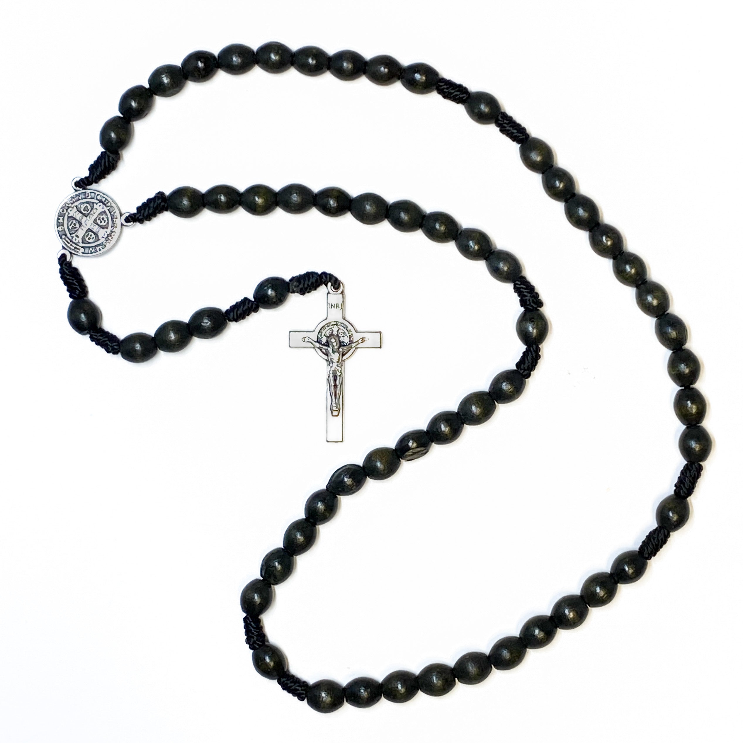 This Medjugorje St. Benedict Rosary - Black from Apostle Gear features polished hardwood beads and heavy-duty cord construction. The rosary's St. Benedict crucifix and St. Benedict medal centerpiece are constructed of solid metal and polished to perfection.