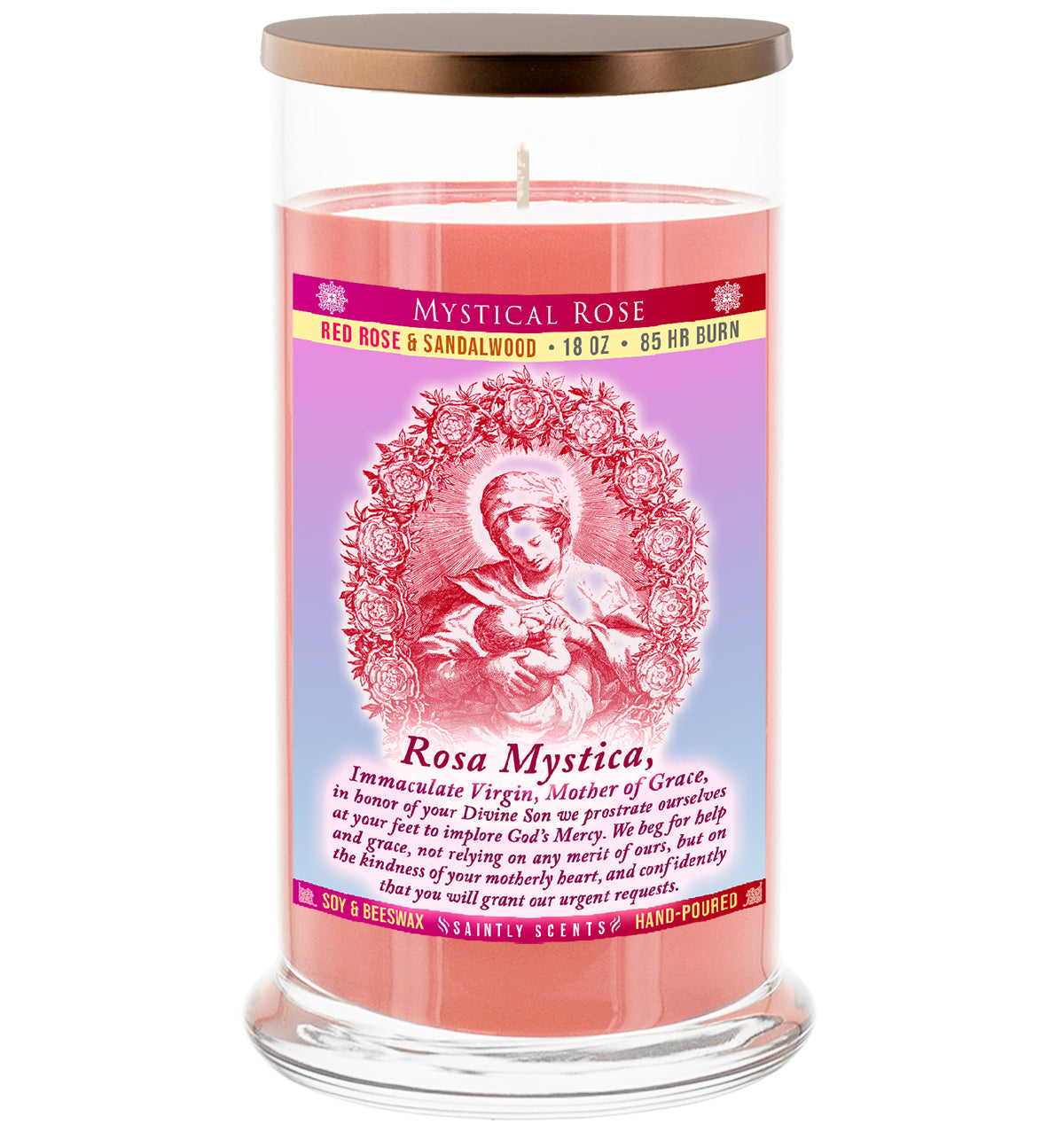 Our hand-poured Our Lady of Roses Scented Prayer Candle scented candle by Saintly Scents features a lovely Mystical Rose fragrance.