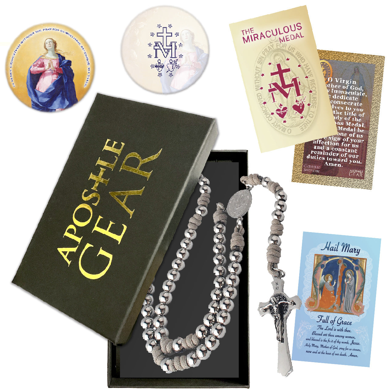 As a medium-sized rosary, the Miraculous Medal Rosary measures approximately 22-inches long and comes as a complete Apostle Gear gift set which includes: