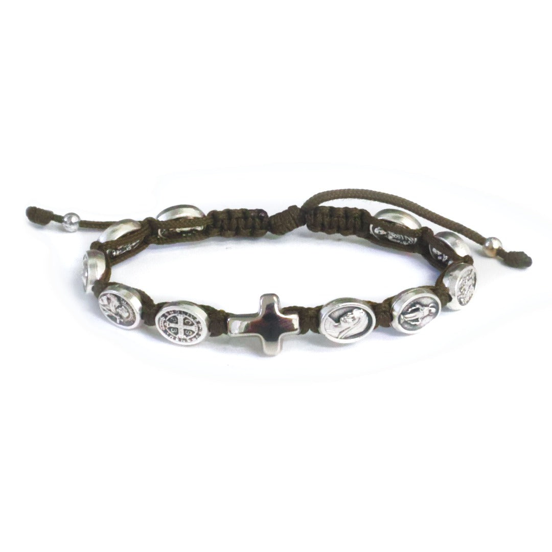 Carry the protection and inspiration of Our Lady, Jesus, and the saints with you every day. This beautiful Catholic bracelet is handcrafted in Medjugorje, featuring 10 silver-tone saint medals and a silver-tone cross interwoven with durable and comfortable braided olive cord.