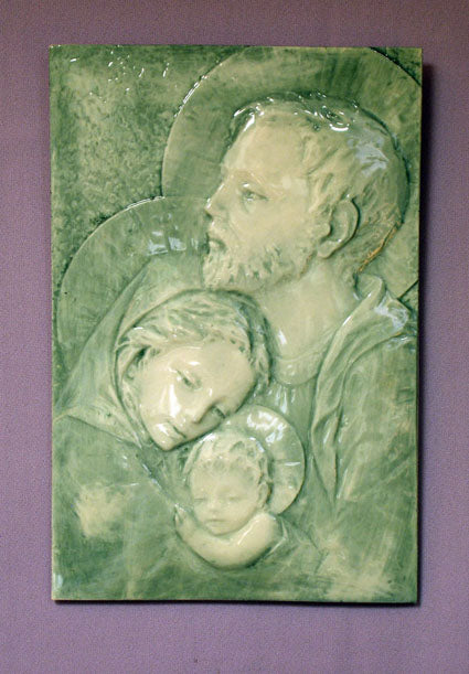 Holy Family Ceramic Plaque Blue 7x10.5-inch is from the renowned Goldscheider collection.