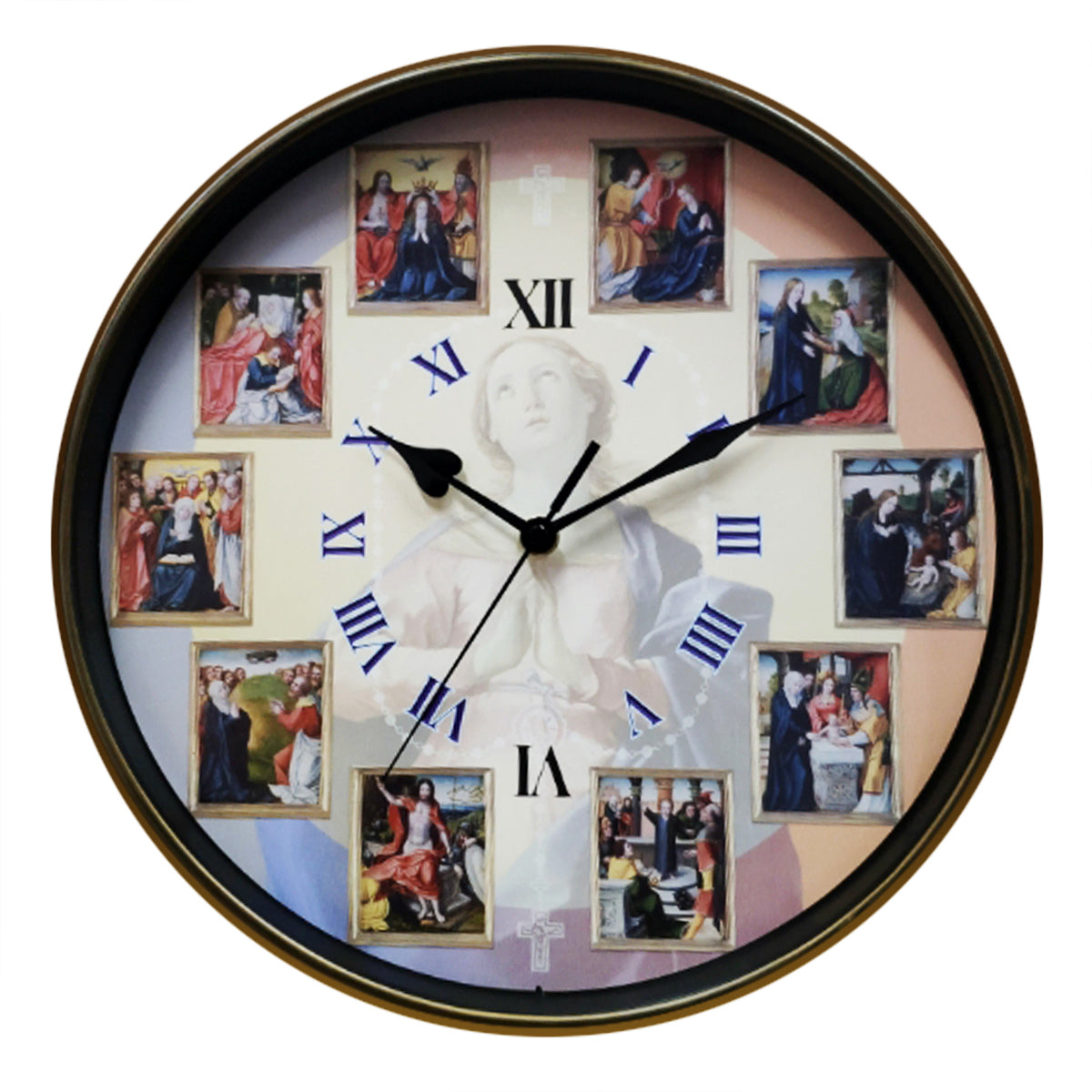Our 12-inch Joyful and Glorious Rosary Wall Clock features ten images from old-world religious art that depict each of the five Joyful Mysteries of the Rosary and the five Glorious mysteries..