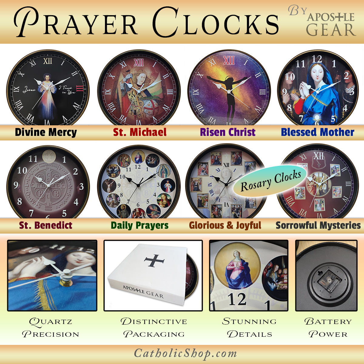 Each Rosary Prayer Clock comes in a sturdy Apostle Gear box, ideal for gift giving or safe storage.