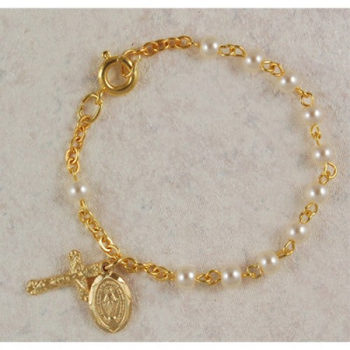 Embrace elegance and faith with our 5 1/2" Gold Pearl Bracelet, designed to inspire and uplift your spirit. Crafted with 4MM Glass Pearl Beads and plated in 18 Kt Gold Over Sterling Silver, this bracelet serves as a beautiful reminder of divine grace and the virtues of purity and devotion. Each time you wear or gift this bracelet, let it be a source of inspiration, encouraging you to reflect on your faith journey.