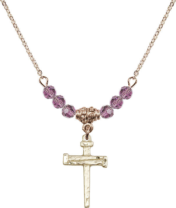 Gold-Plated Necklace with 4mm Light Amethyst Crystal Beads & 14K-Filled Nail Cross Medal