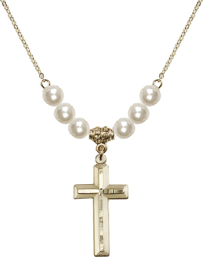 18" Plated Necklace with 6mm Faux-Pearl Beads & 14K-Filled Cross Medal | Engravable