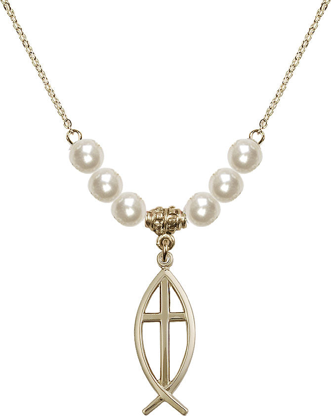 Gold-Plated Necklace with 6mm Faux-Pearl Beads & 14K-Filled Fish / Cross Medal