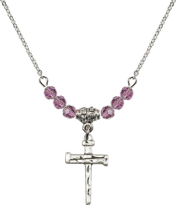 Our 18" Rhodium Plated Necklace with 4mm Light Amethyst Crystal Beads featuring a Sterling Silver Nail Cross Medal. is proudly manufactured in the USA.