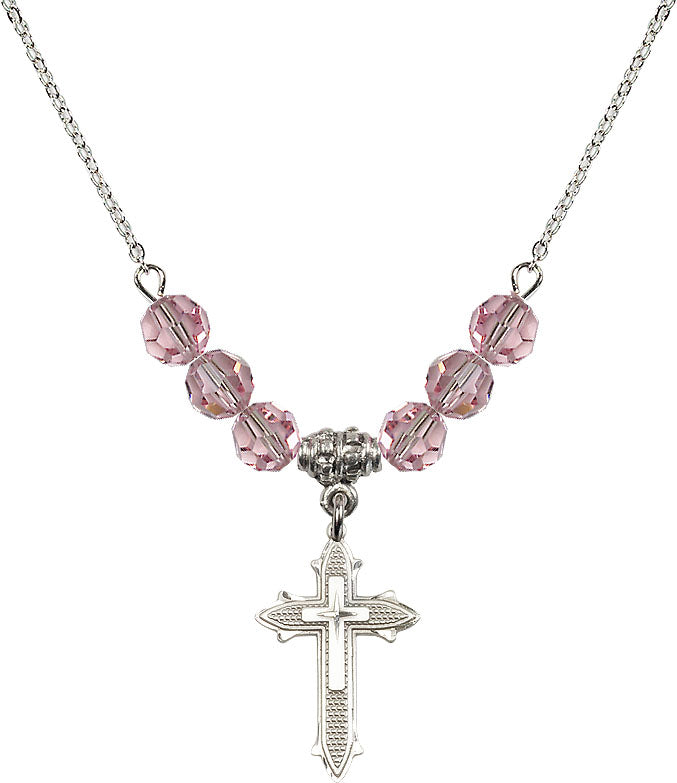 Our 18" Rhodium Plated Necklace with 4mm Light Rose Crystal Beads featuring a Sterling Silver Cross on Cross Medal. is proudly manufactured in the USA.