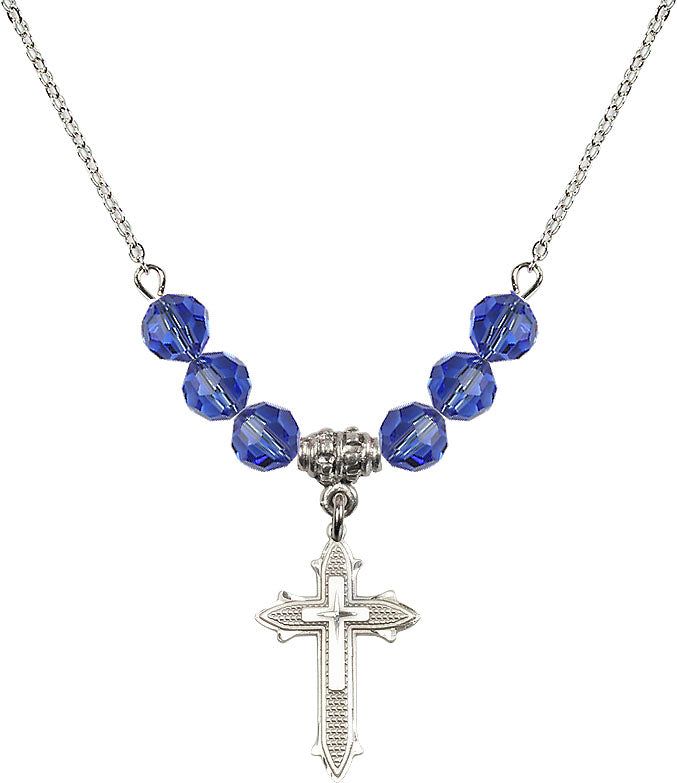 Our 18" Rhodium Plated Necklace with 4mm Sapphire Crystal Beads featuring a Sterling Silver Cross on Cross Medal. is proudly manufactured in the USA.