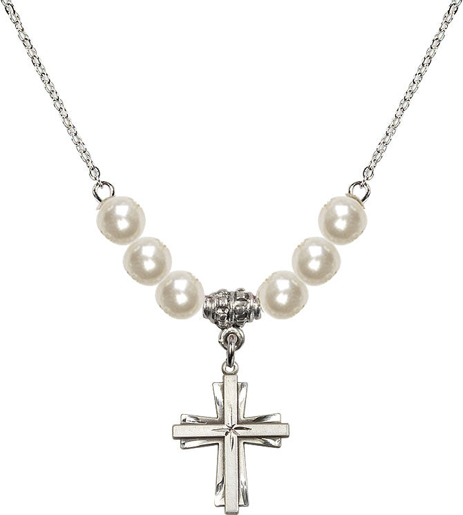Our 18" Rhodium Plated Necklace with 6mm Faux-Pearl Beads featuring a Sterling Silver Cross Medal. is proudly manufactured in the USA.