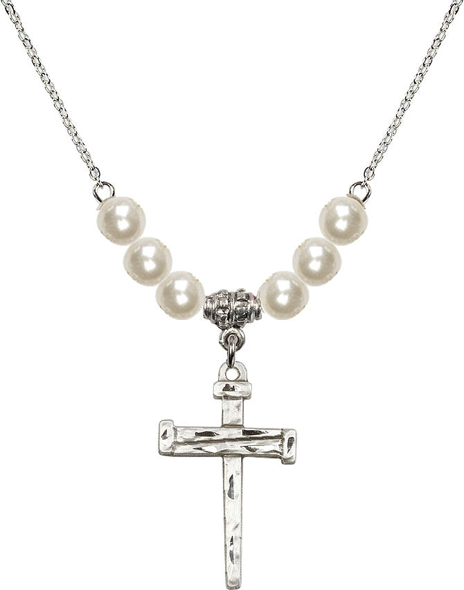 Our 18" Rhodium Plated Necklace with 6mm Faux-Pearl Beads featuring a Sterling Silver Nail Cross Medal. is proudly manufactured in the USA.