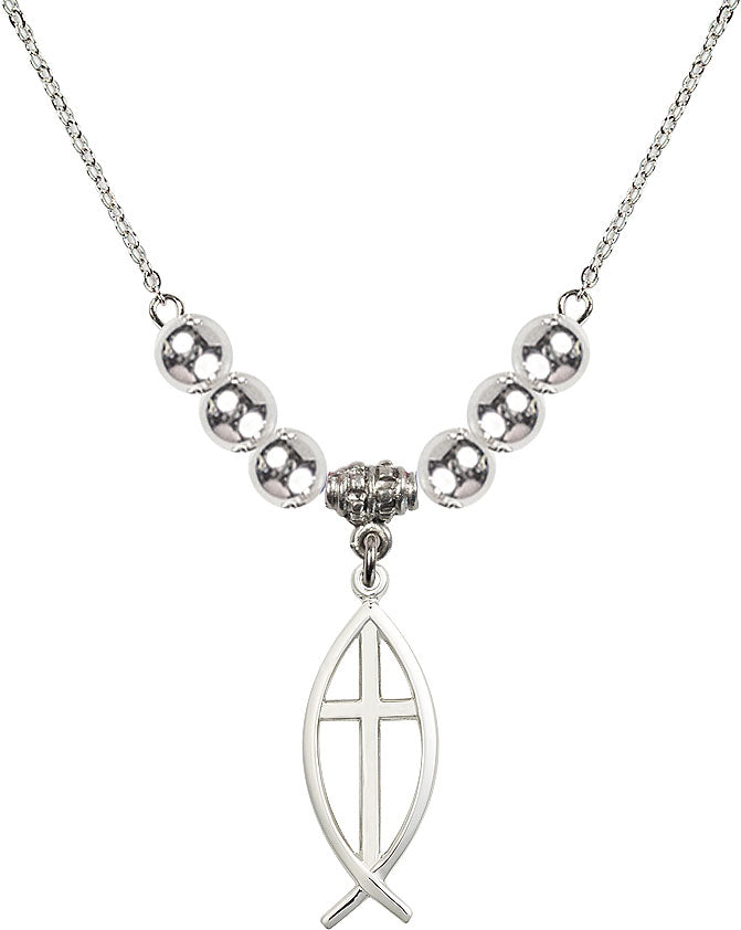 Our 18" Rhodium Plated Necklace with 6mm Sterling Silver Beads featuring a Sterling Silver Fish / Cross Medal. is proudly manufactured in the USA.