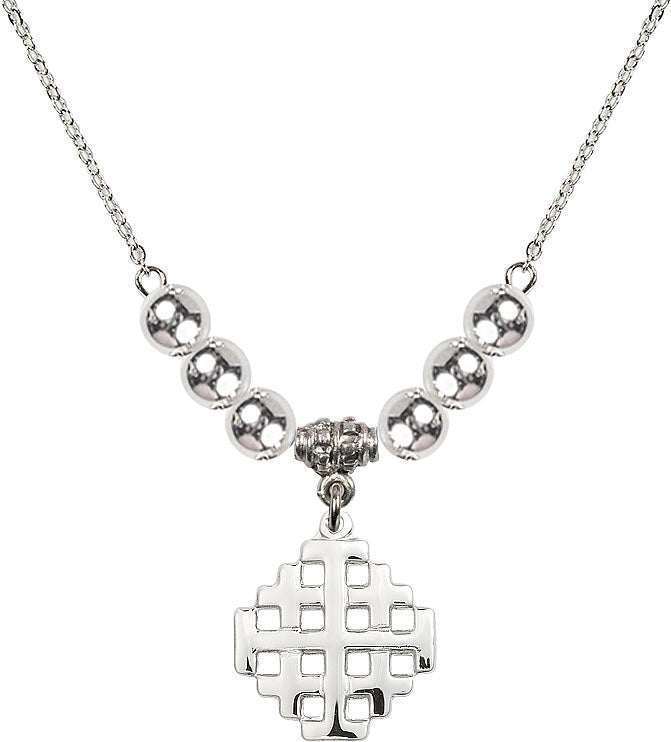 Our 18" Rhodium Plated Necklace with 6mm Sterling Silver Beads featuring a Sterling Silver Jerusalem Cross Medal. is proudly manufactured in the USA.