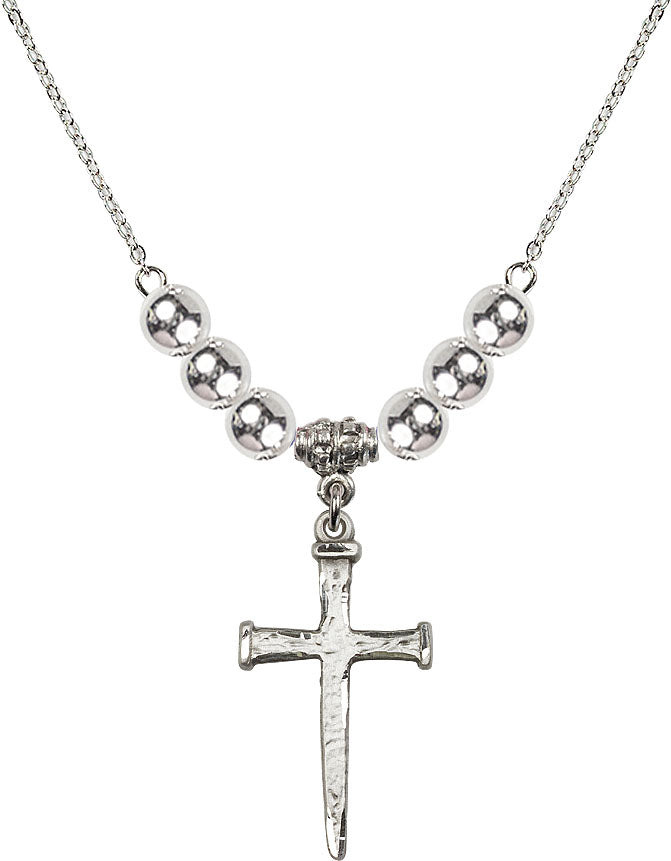 Our 18" Rhodium Plated Necklace with 6mm Sterling Silver Beads featuring a Sterling Silver Nail Cross Medal. is proudly manufactured in the USA.