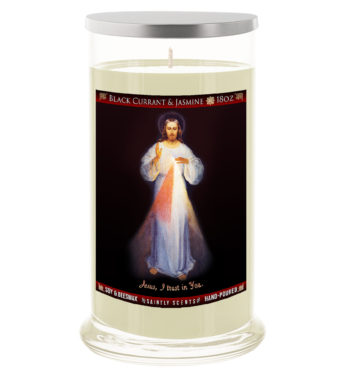 Our hand-poured Divine Mercy Painting Scented Prayer Candle scented candle by Saintly Scents features a lovely Black Currant and Jasmine fragrance.