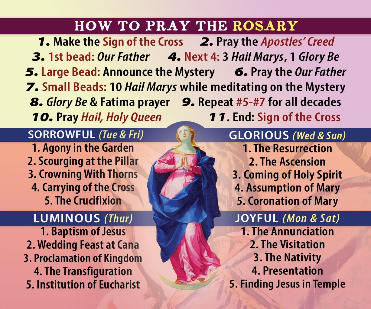 Our handmade Hail Mary Scented Prayer Candle features imagery of Our Lady, the Hail Mary prayer, and a rosary guide on the back.