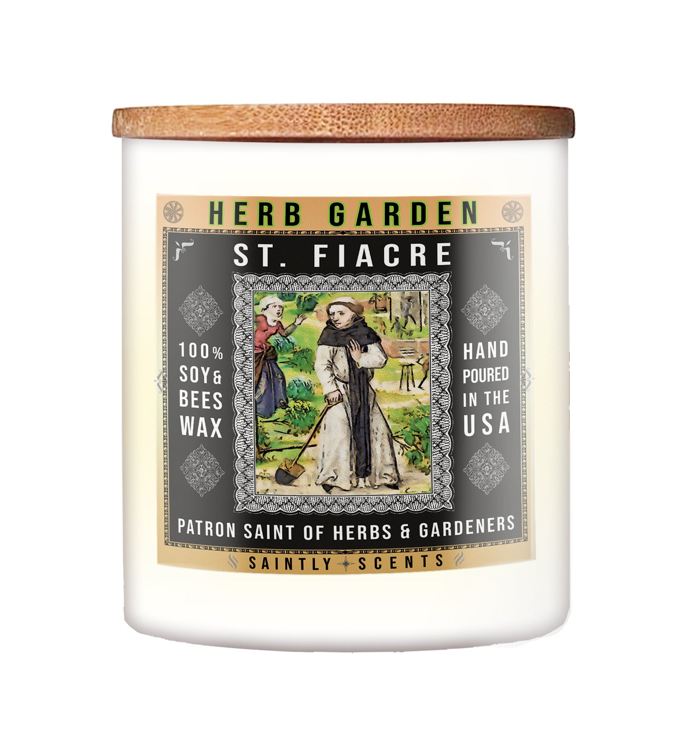 Our handmade St. Fiacre scented candle by Saintly Scents features a Herb Garden fragrance in honor of the patron saint of herbs and gardeners. Fill your home with a lovely mix of kitchen herbs including rosemary, sage, thyme, basil, oregano, chives, and more.