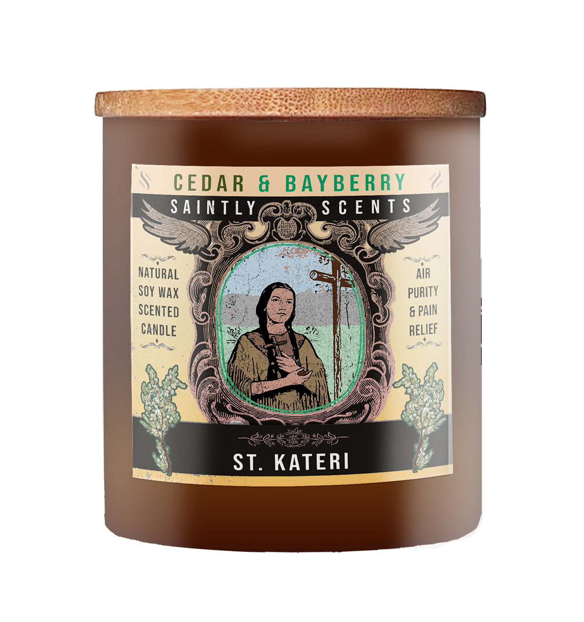 Kateri's life of piety and devotion led to her being the first Native American to canonized as a saint by the Catholic Church. Saint Kateri's official feast day is July 14. The woodsy, musky, and joyful scent of cypress tree and bayberry tree makes this scented candle a perfect reminder of the pristine forests in which St. Kateri lived.