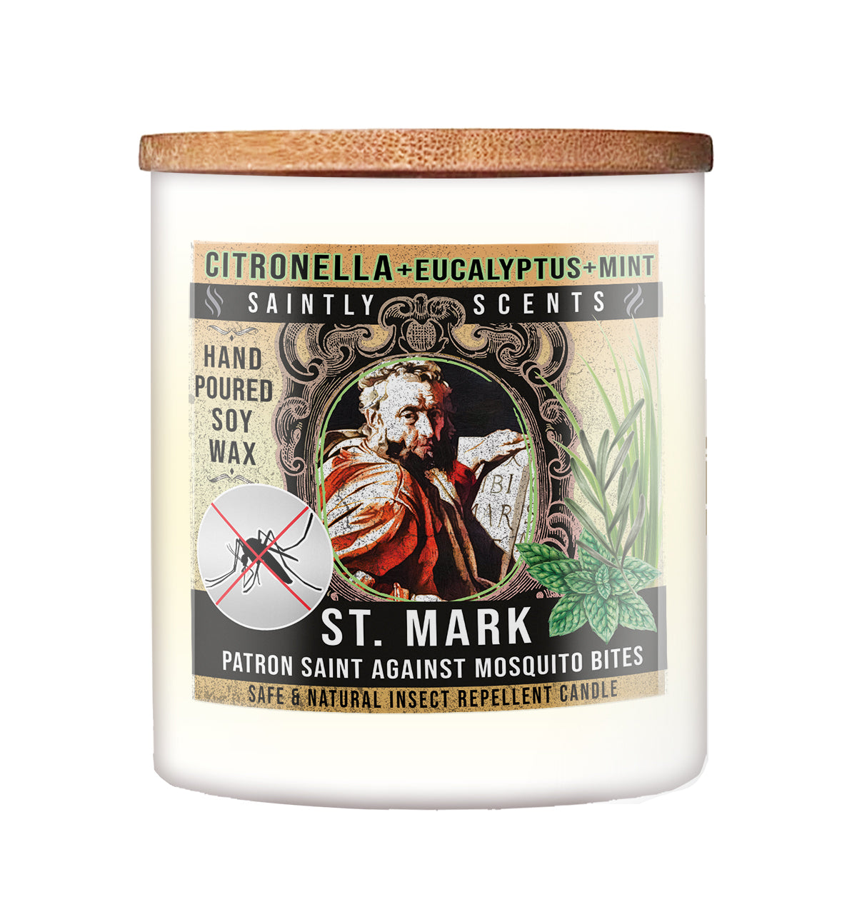 Our handmade St. Mark the Evangelist scented candle by Saintly Scents features a Citronella, Eucalyptus and Mint fragrance in honor of the patron saint of people dealing with insect bites. That's right: St. Mark is often prayed to for help against mosquitoes, but he's is also the patron saint of lawyers, notaries, opticians, pharmacists, painters, secretaries, interpreters, prisoners, and even lions! Our citronella candle is proven to ward off mosquitoes and other biting insects. We've improved the scent by adding two other known insect repellent scents: eucalyptus and mint. St. Mark's feast day is April 25, but you can burn this lovely scented candle any time of the year to make sure that bugs don't feast on you! .