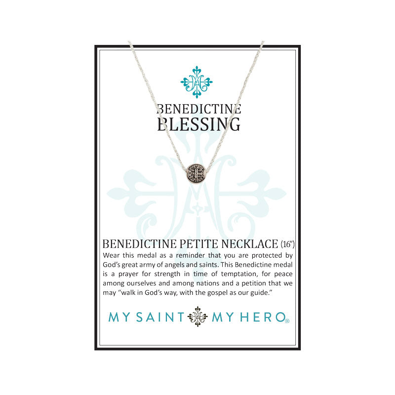 16" silver tone chain with a silver-dipped 1 cm Benedictine medal. Our Benedictine Petite Necklace comes with an inspirational card. The Benedictine cross is the most powerful symbol of protection. Wear this necklace as a reminder that you are protected by God’s great army of Angels and Saints.