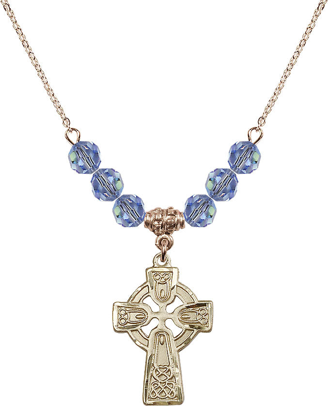Gold-Plated Necklace with 4mm Light Sapphire Crystal Beads & 14K-Filled Celtic Cross Medal
