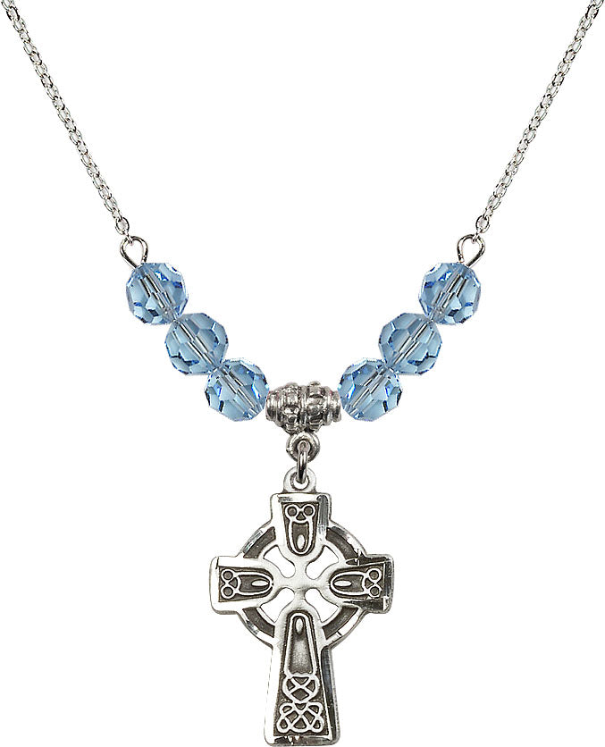 Our 18" Rhodium Plated Necklace with 4mm Aqua Crystal Beads featuring a Sterling Silver Celtic Cross Medal. is proudly manufactured in the USA.