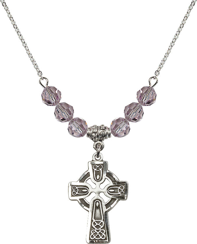Our 18" Rhodium Plated Necklace with 4mm Light Amethyst Crystal Beads featuring a Sterling Silver Celtic Cross Medal. is proudly manufactured in the USA.