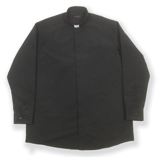 18.5-inch 32/33 Arm Length 100% Cotton Black Long Sleeve Single Pocket Clergy Shirt. This Highest Quality European Tailored Shirt is made with the finest fabrics available. Our Handsome First Quality European Dyed Cloth helps maintain color and shape.