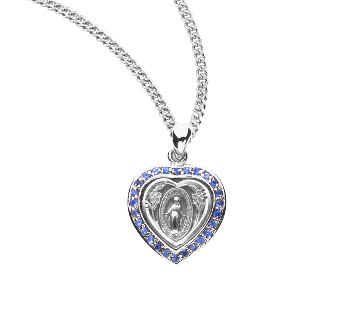 3/4-inch Sterling Silver Miraculous Medal Made in the USA. The Traditional Shape Medal is in Heart Shaped Setting with 26 Finest Austrian Crystal Sapphire Set Cubic Zircons Embellished Rays of Light around Fancy Border is Adorned with finely detailed Blessed Mother Mary with rays coming out of her extended hands.The Reverse Side of the Medal Portrays an "M" with a Cross on the top and the "Sacred Hearts" underneath surrounded by Twelve Stars.