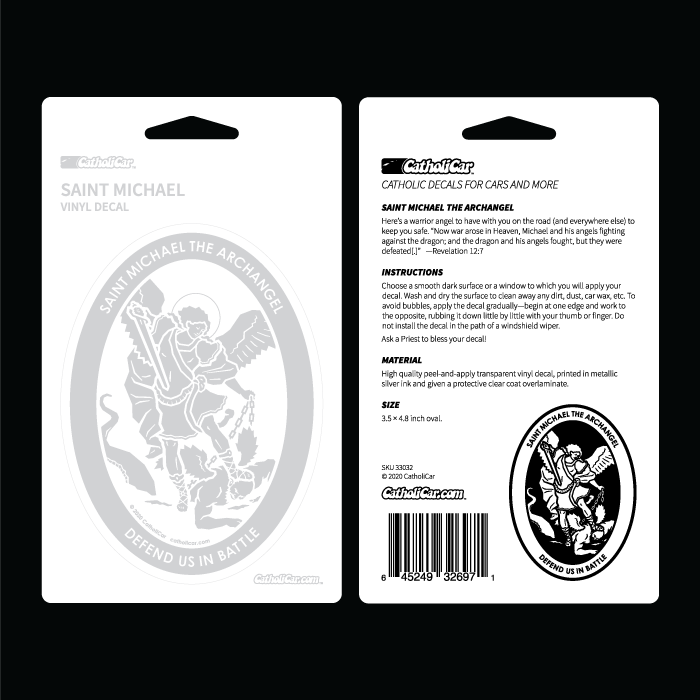 Show your Catholic pride with our St. Michael Vinyl Transparent Silver Decal from CatholiCar. This Transparent decal by CatholiCar is simple to use: just peel and apply! It's printed in metallic-silver ink on transparent vinyl and given a protective clear-coat overlaminate. Made to last!