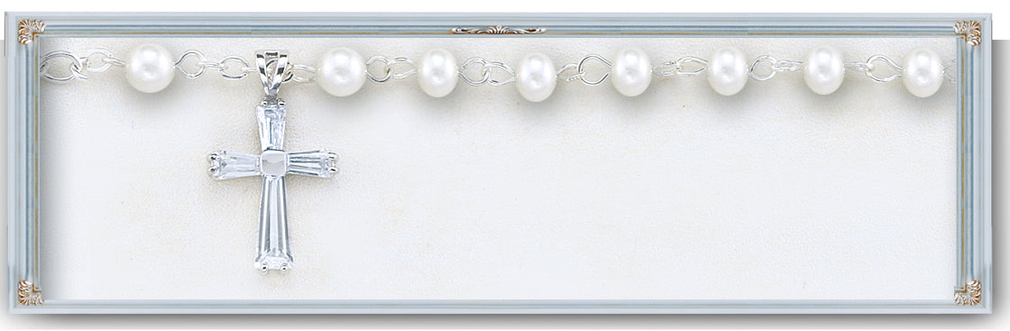 Embrace your faith with our exquisite 4mm Pearl Rosary Bracelet, designed to inspire prayer and reflection. Crafted with beautiful 4mm pearls and adorned with a stunning Silver Cubic Zircon Cross and Rhodium Plated Brass Findings, this bracelet serves as a wearable reminder of God's love and grace. Perfect for personal devotion or as a thoughtful gift for a loved one, it comes elegantly packaged in a lovely gift box.