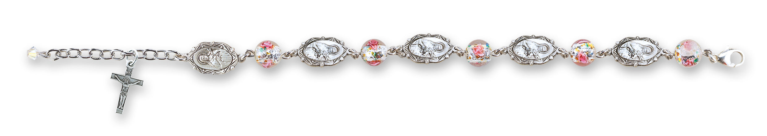 Saint Therese Bracelet with 8mm Rose Embedded Venetian Glass Beads with Five Sterling Silver Saint Therese Medals and Crucifix with Rhodium Plated Brass Findings. Deluxe Velour Gift Box is Included.