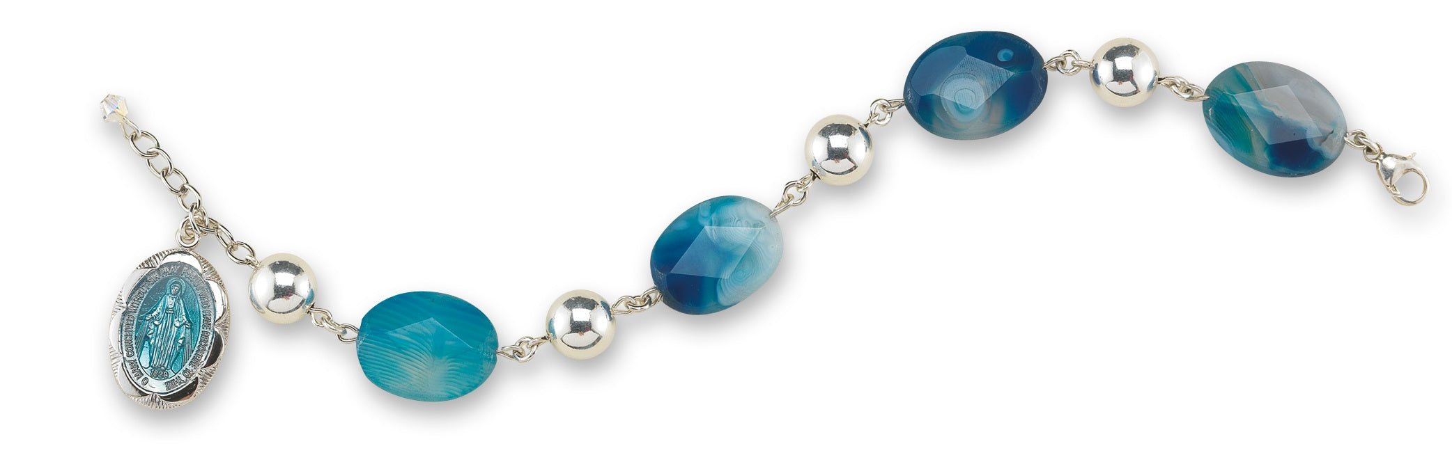 15x20mm Faceted Blue Agate Stone Bracelet with 10mm Round Sterling Silver Beads and a 13/16-inch Enameled Miraculous Medal with Rhodium Plated Brass Findings. It comes in a deluxe gift box.
