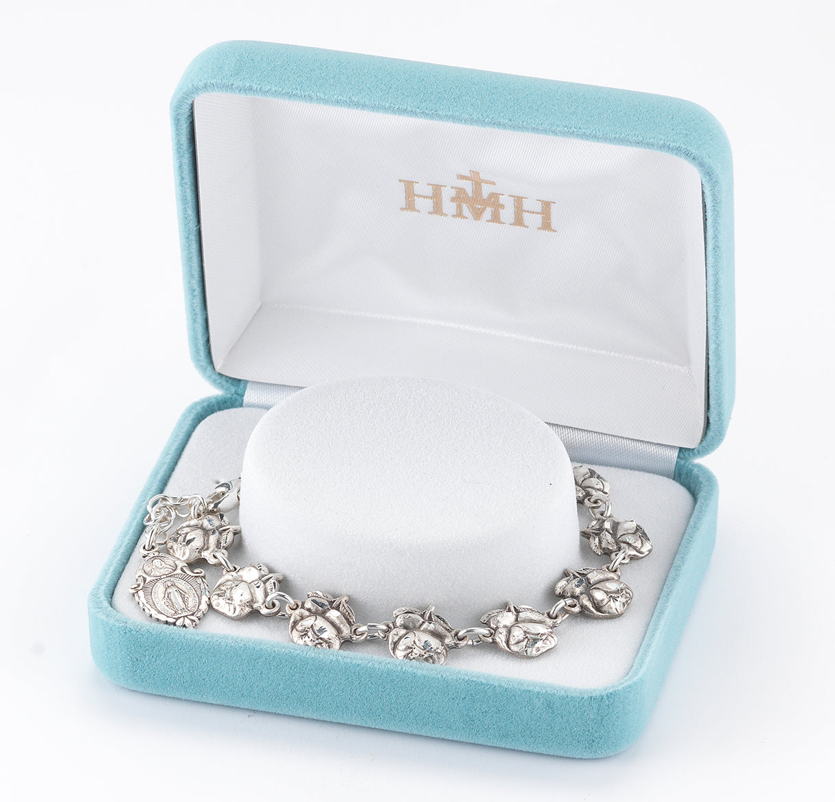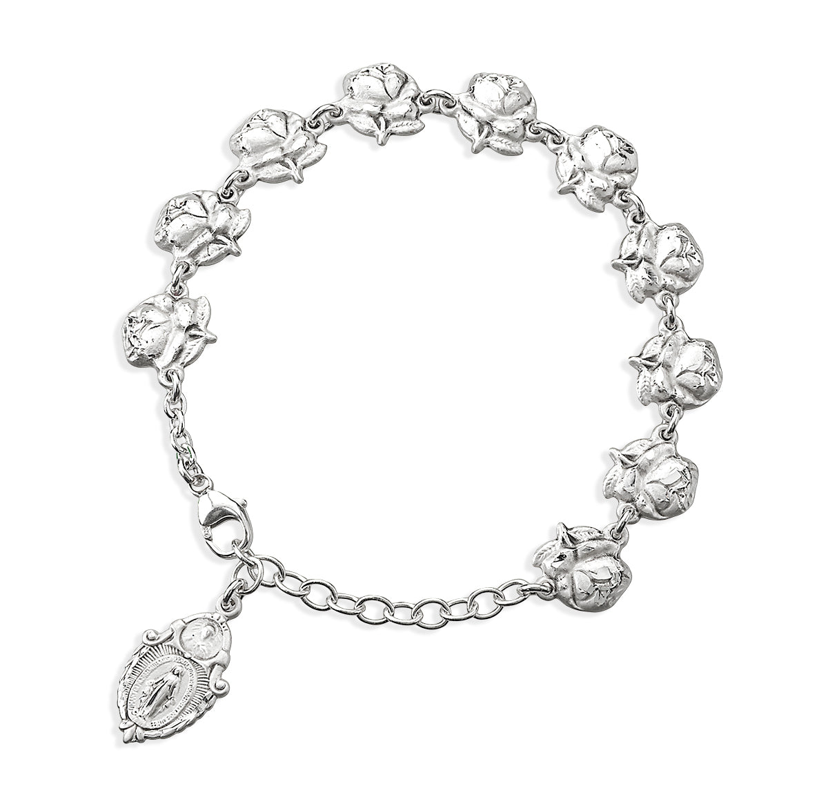 This Sterling Silver Rose Bud Beads with Saint Images on Bracelet is made in the USA.