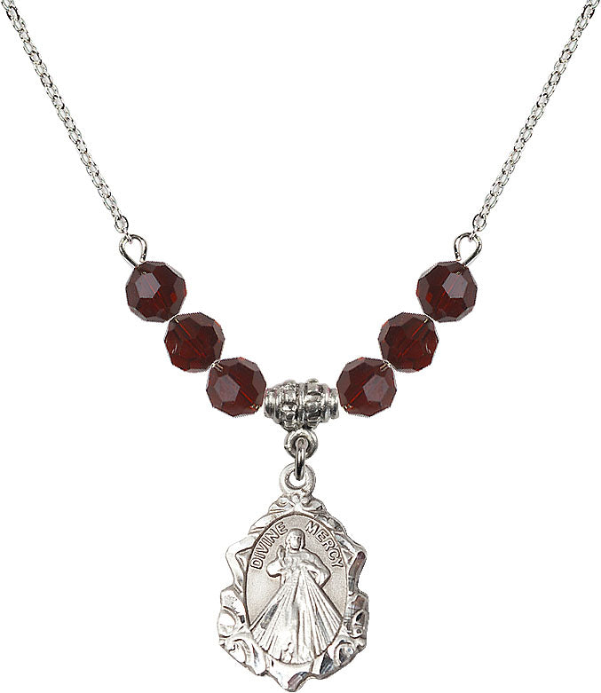 Our 18" Rhodium Plated Necklace with 4mm Garnet Crystal Beads featuring a Sterling Silver Divine Mercy Medal. is proudly manufactured in the USA.