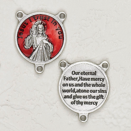 These ¾-inch Divine Mercy enameled centers feature the sacred image of Jesus with rays of red and white light streaming from His Heart, symbolizing the blood and water that flowed from His side. The vibrant red enamel border beautifully frames this powerful depiction of Christ's infinite mercy, making each piece a meaningful addition to handcrafted rosaries or religious jewelry projects.