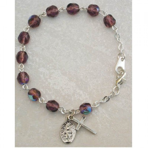 6 1/2" Dark Amethyst Bracelet is a beautiful expression of faith and devotion. Crafted with 6MM glass beads and featuring a stunning rhodium plated crucifix, this bracelet serves as a daily reminder of God's love and sacrifice. The deep purple hue of amethyst symbolizes peace and spiritual insight, making it an ideal accessory for prayer and meditation.