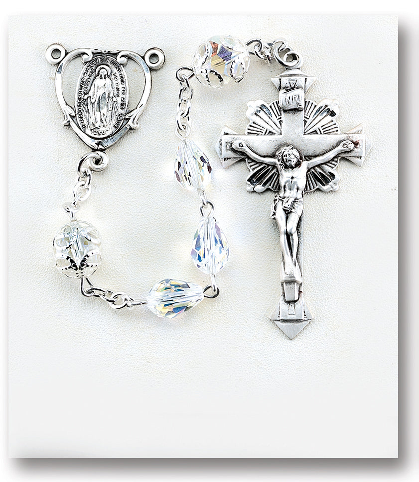 This Aurora Tear Shaped Finest Austrian Crystal Sterling Rosary is made in the USA.