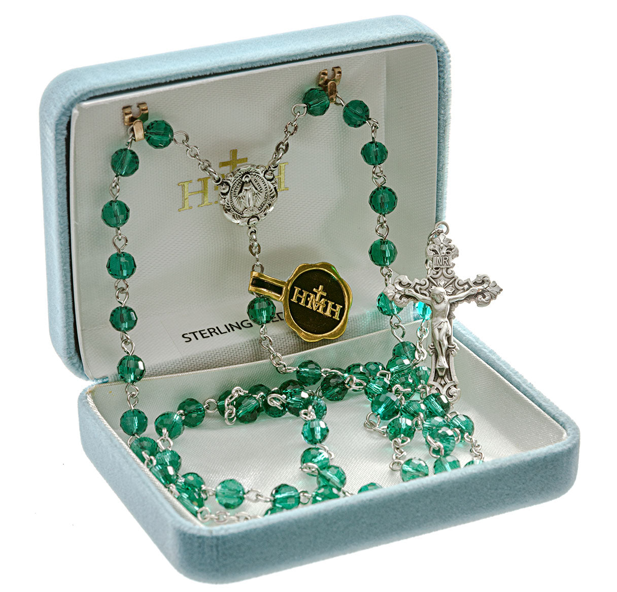 This Emerald Tin Cut Crystal Rosary is made in the USA.