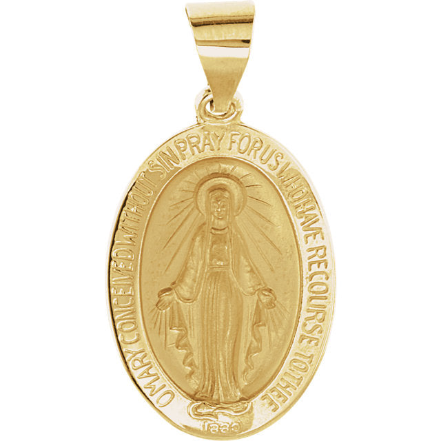 Sale! This 14 Karat gold Miraculous Medalavailable from Catholic Shop.comfeatures dimensions of 19 X 13.5 millimeters, approximately 3/4 inch by 1/2 inch. The medium size makes it ideal for women.