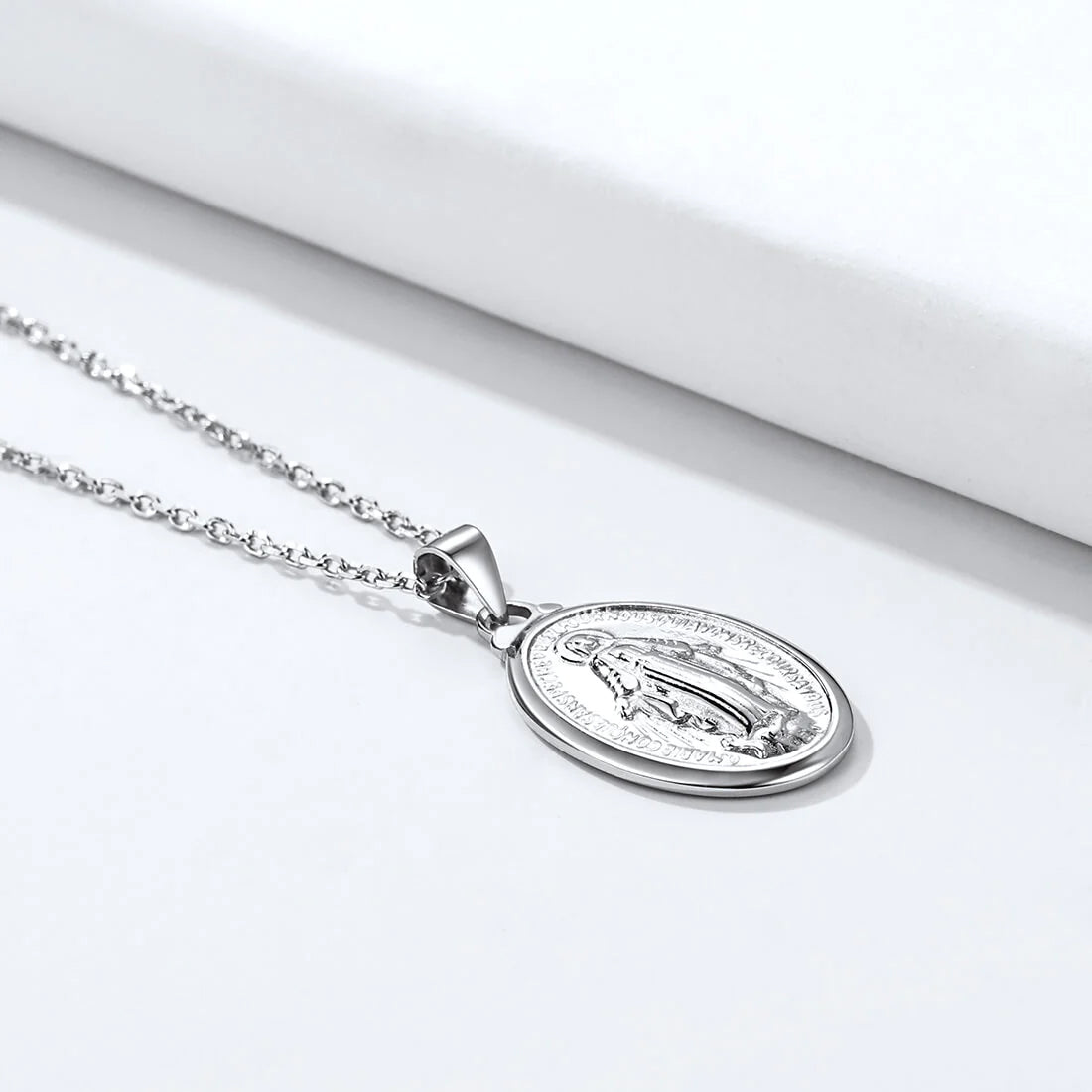 This beautiful but affordable Sterling Silver Miraculous Medal from Apostle Gear comes with a silver chain with a black velvet jewelry box, inside a white craft gift box with lid.