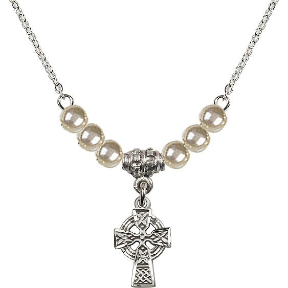 This 18-Inch Rhodium Plated Necklace comes with 4mm Faux-Pearl Beads and a Celtic Cross charm and features the Catholic Shop.com money-back guarantee.